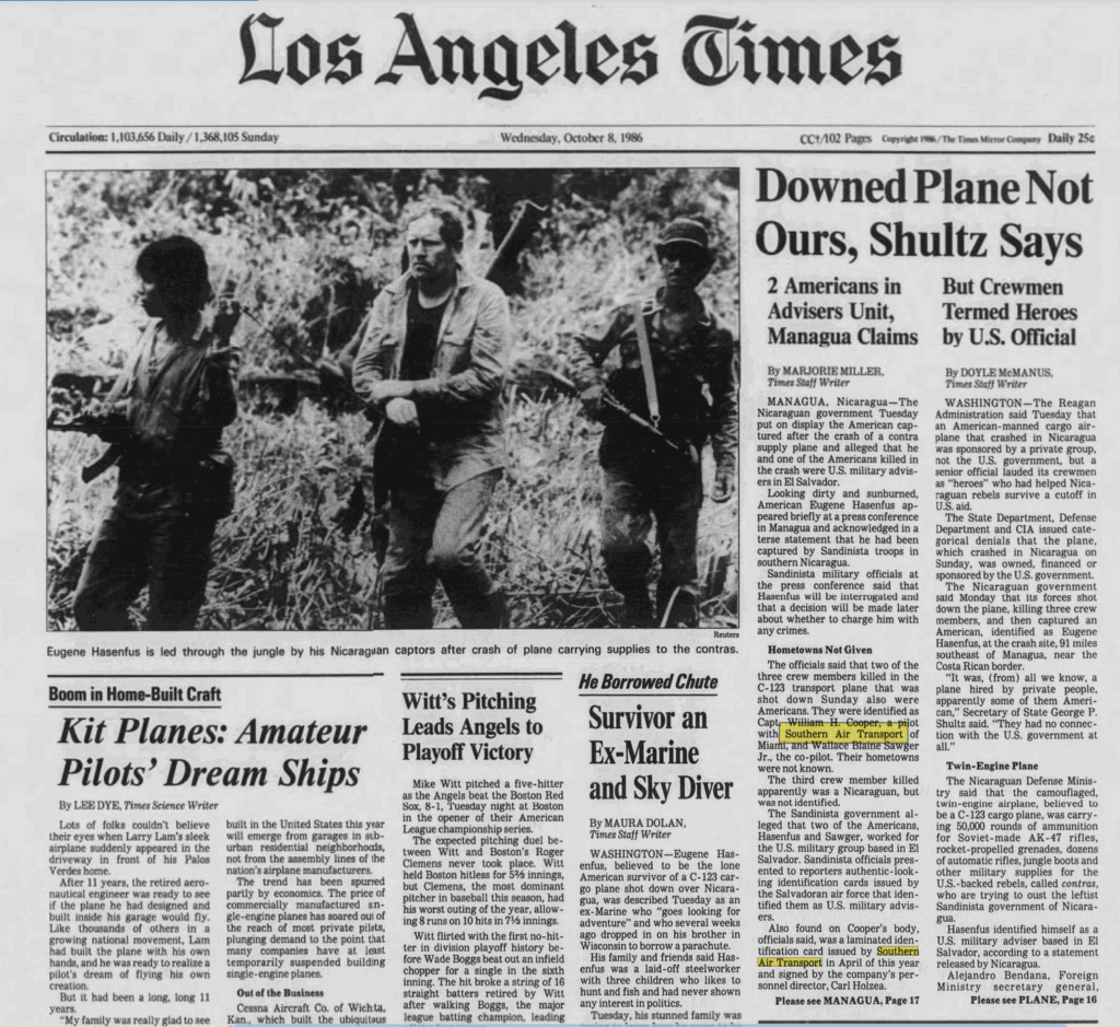 The downing of the plane and the testimony of its lone survivor, Eugene Hasenfus, pulled a string that eventually unraveled the scandal known as Iran–Contra. Using Southern Air Transport planes, the CIA was shipping weapons to Iran, using Israel as a middleman, and deploying the profits to arm the Contras against the leftist Nicaraguan government.