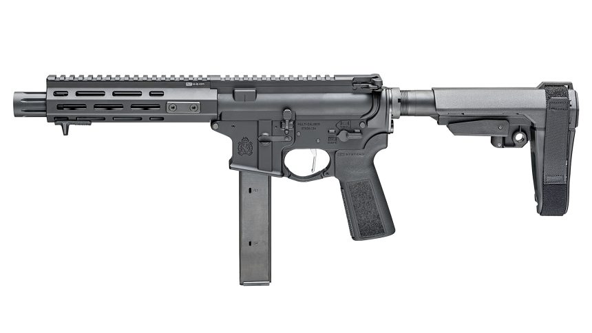 At the muzzle there is the SA Muzzle Drum that is recessed under the pistol’s freefloat handguard. The handguard features M-Lok slots for adding accessories and an M-Lok handstop is included on the lower section of the handguard. A QD mount is located on the receiver end plate for sling use. The pistol feeds from Colt-pattern, 32-round magazines, and it has an adjustable SB Tactical SBA3 pistol brace on the receiver extension. There is also a B5 Systems polymer trigger guard, B5 Systems Type 23 P-Grip and a 45-degree, short-throw ambidextrous safety.